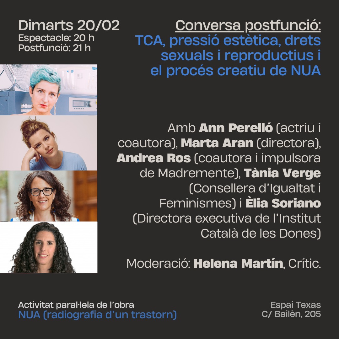 Dimarts 20 de febrer es va reestrenar NUA , radiografia d'un trastorn, escrita per Ann Perelló i Andrea Ros i dirigida per Marta Aran a l'Espai Texas de Barcelona. L'espectacle es podrè veure fins al 5 de març i comptarà amb un cicle de col·loquis postfunció sobre la pressió estètica i els TCA moderat per la periodista Helena Martín.