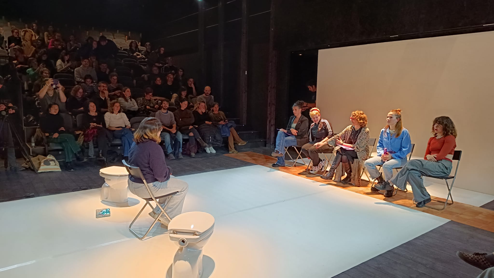 El primer col·loqui del dia 20 de febrer va comptar amb la participació de Tània Verge, Consellera de Feminismes i Igualtat; Èlia Soriano, directora executiva de l'Institut Català de les Dones; Anna Perelló i Andrea Ros, autores de l'obra, i Marta Aran, directora de l'espectacle.