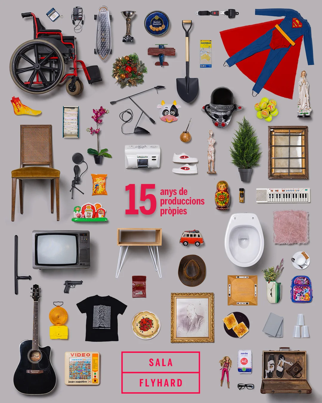 Celebramos 15 años y hemos querido mirar atrás y recordar todas las obras que hemos producido y exhibido en la sala a lo largo de estos años, plasmadas en un cartel conmemorativo. Algunas han dado el salto a otros teatros, algunas han realizado giras larguísimas, otras solo se han exhibido en la sala; algunas se han convertido en películas o incluso en series, y algunas las hemos reprogramado en la propia sala con repartos diferentes… Trayectorias diversas, pero un mismo inicio, el pequeño espacio de la Sala Flyhard; y una misma manera de afrontar cada producción: con la máxima profesionalidad y cuidado.
